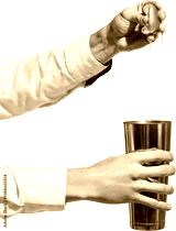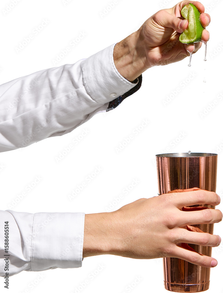 Mixology in motion. Male hands in white shirt squeezing fresh lime into copper shaker with juice drops falling mid-air, transparent background. Concept of cocktail making, bartending, fresh mixology.