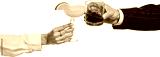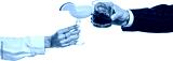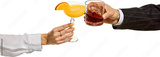 Female and male hands clinking cocktails orange drink in coupe glass with slice of citrus and dark liquor in faceted tumbler. Transparent background. Concept of toast, party, elegance, contrast.