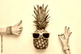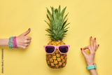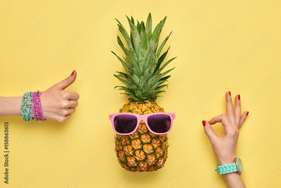 Fashion Hipster Pineapple. Female hand OK, YES Gesture Stylish Trendy Watches, Glamor Accessories. Bright Summer Color. Tropical pineapple, Sunglasses. Creative Art concept. Minimal. Summer background
