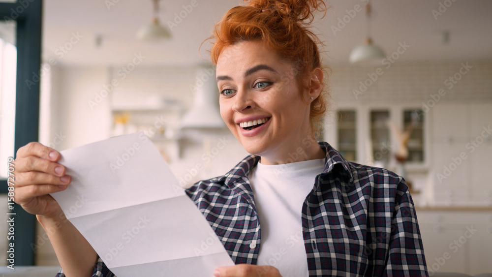 Caucasian woman lady girl at home couch sofa female open envelope receive letter offer notification good news invitation card reading smiling happy win achieve loan mortgage insurance credit approve