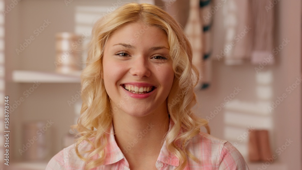 Happy smiling toothy positive satisfied Caucasian woman girl female lady teen in glamour pink interior at home looking at camera face healthy skin smile fashion style person model portrait good mood