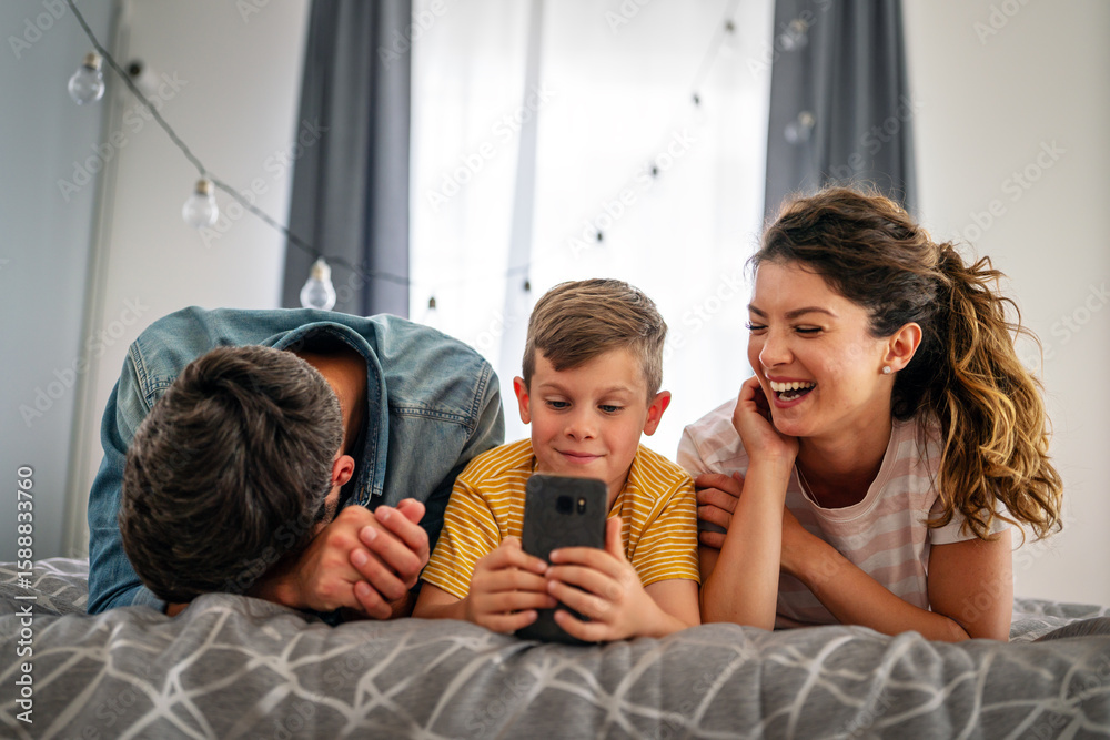 Happy family and kid having fun with smartphone, digital gadget at home. People, technology