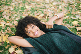 Young black happy woman relaxing and doing thumbs up in autumn. Happiness and relax concept.