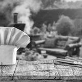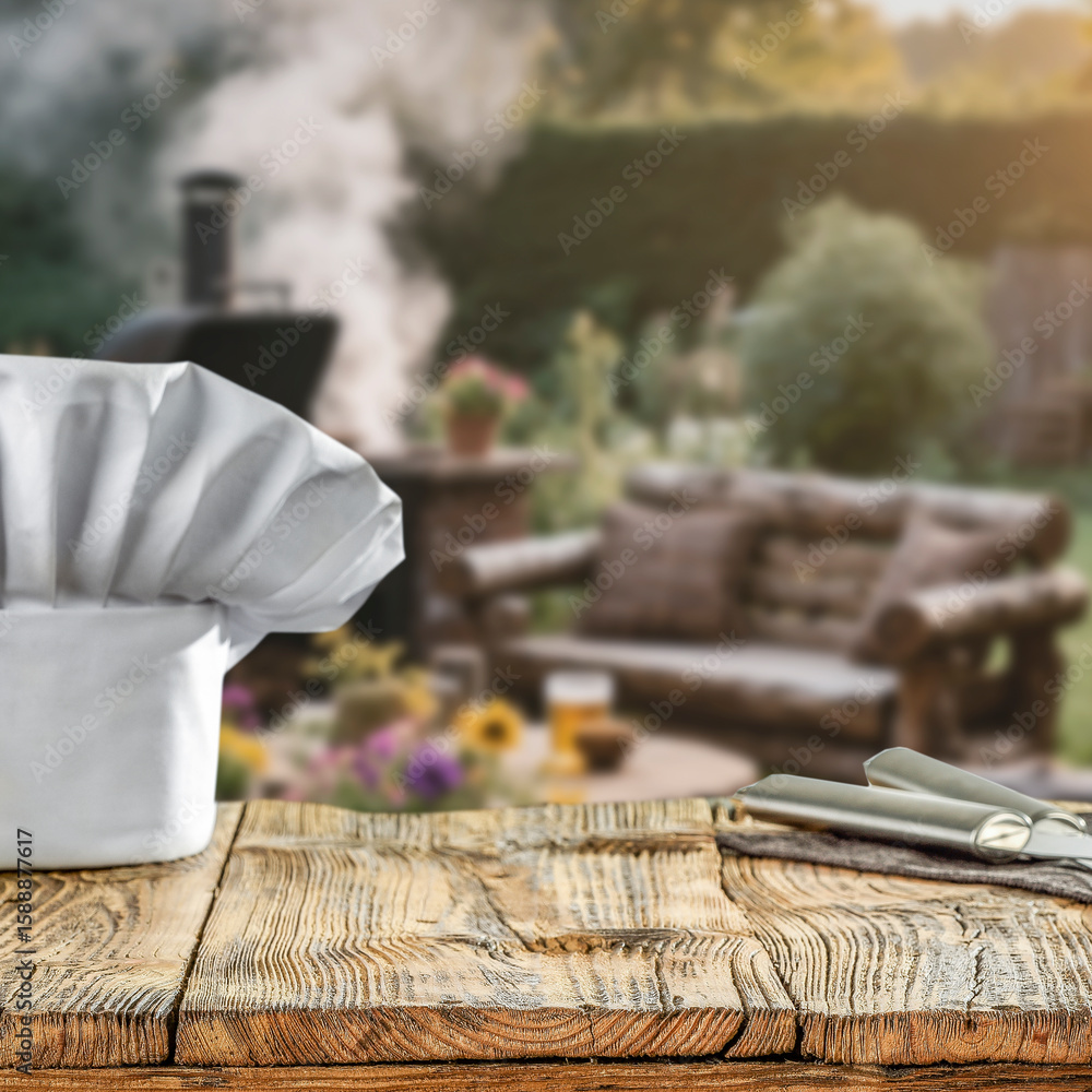 Chef hat and grilling tools on wooden table in backyard – outdoor cooking and barbecue concept with product space