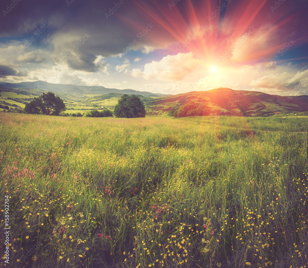 Panoramic view of the blooming flowers, summer meadow in the mountains and blue cloudy sky. Alpine seasons, natural background.Filtered image:cross processed vintage effect.
