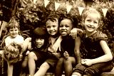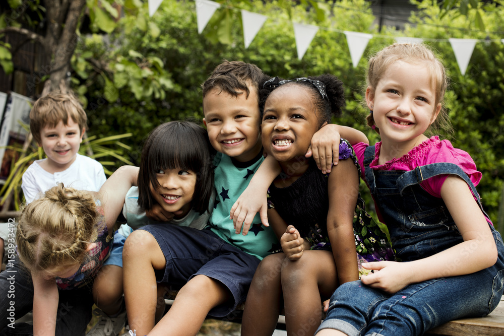 Group of kindergarten kids friends arm around sitting and smiling fun