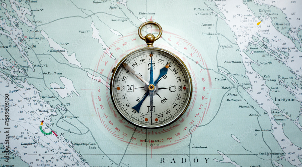 Magnetic old compass on old map. Travel, geography, history, navigation, tourism and exploration concept background. Retro compass on geography map.