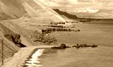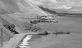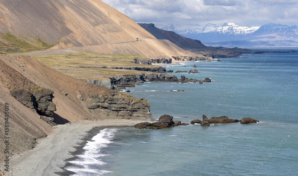 The Ring Road going through the eroded mountain slope above the rocky coastline, Austur Skaftafellssýsla, East Iceland