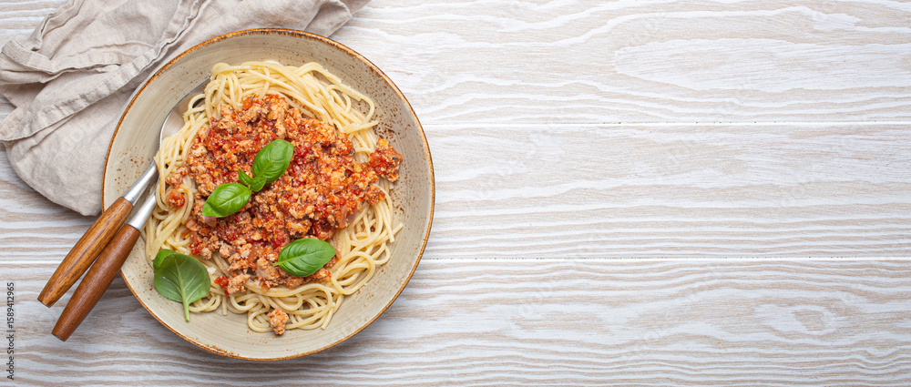 Plate of spaghetti bolognese, topped with fresh basil leaves, sits on a white wooden table with a linen napkin