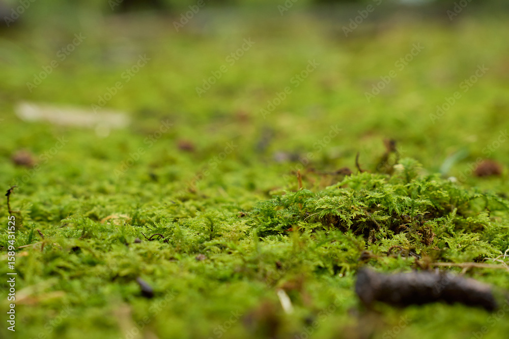 雨に濡れてしっとり青々と茂る苔の背景用テクスチャ。ローアングルでのクローズアップ撮影。