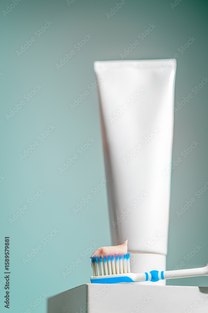 A toothbrush with blue and white bristles holds a dab of pink toothpaste in front of a dental care tube on blue background. Perfect for oral hygiene ads, dental health blogs, or product promotions.
