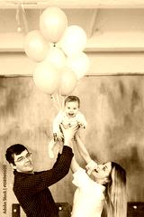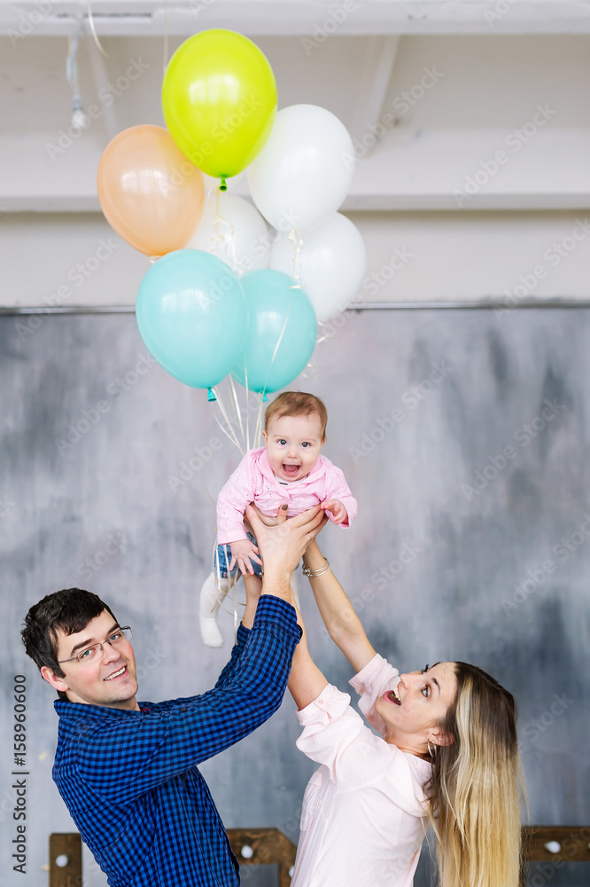 Happy parents and their little daughter. Portrait of a young family with balloons.