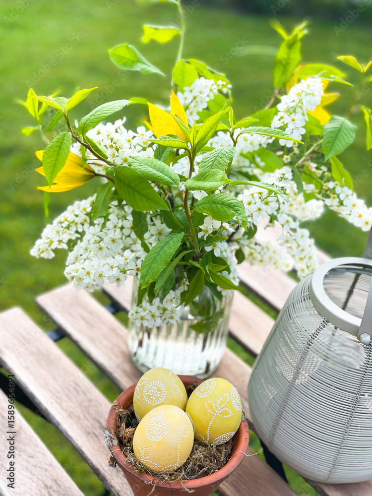 Happy Easter - greeting card - easter background - eggs in a basket on a wooden table with white and yellow flowers in a vase