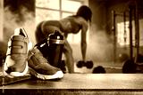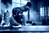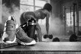 Sports shoes and water bottle with copy space. Blurred fit woman while intense strength workout in gym with sunlight and smoke – concept of fitness, endurance, motivation and healthy lifestyle