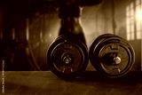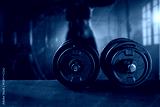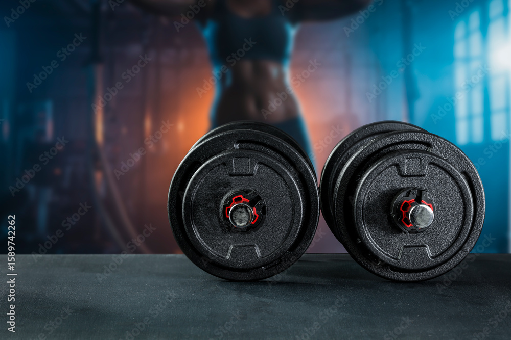 Dumbbells and weights in gym. Blurred silhouette of fit woman while intense strength workout in cinematic gym with sunlight and smoke – concept of fitness, endurance, motivation and healthy lifestyle