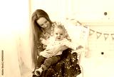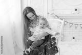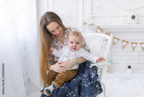 Portrait of laughing young mum together with a small son in a white room interior