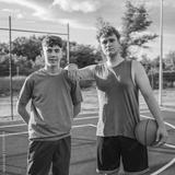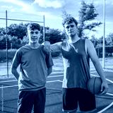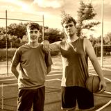 Friends basketball teenage players stand on the court with ball
