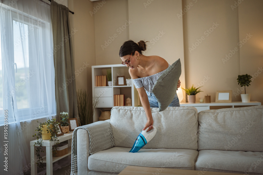 stylish adult woman stand and vacuuming sofa with hand vacuum cleaner