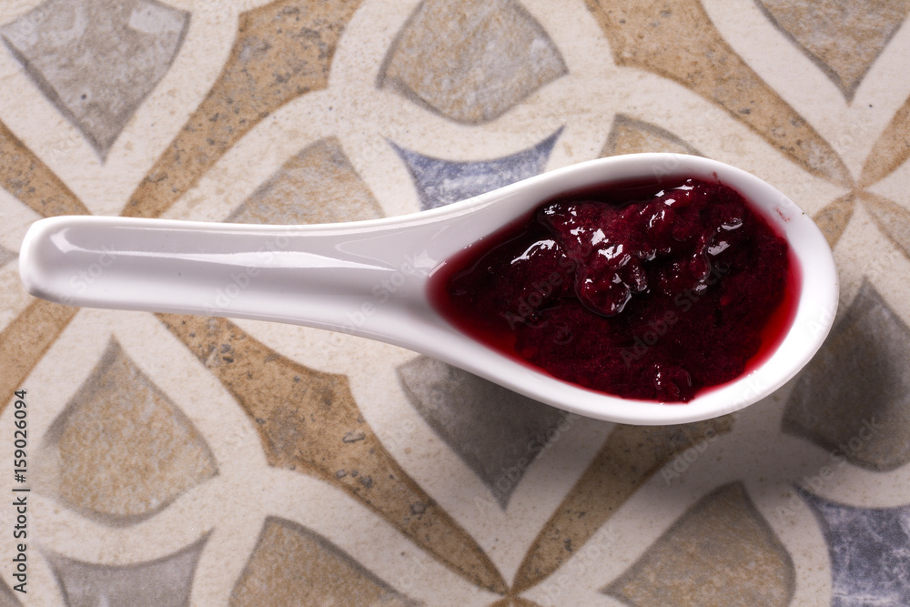 Red fruit cream on the spoon