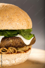 Close-up of home made tasty burgers with beef, cheese,arugula on wooden table. cranberry hot sauce.