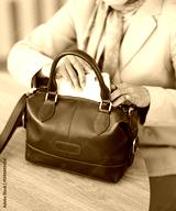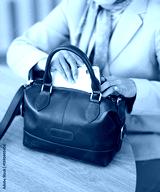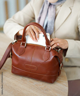 A woman's body wearing a hijab and formal attire puts her gadget into a brown leather bag.