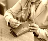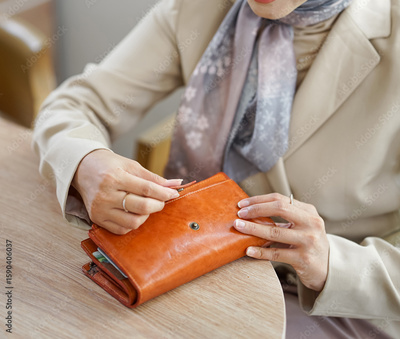 A woman's body wearing a hijab, in formal attire, holds a brown leather purse on a cafe table.