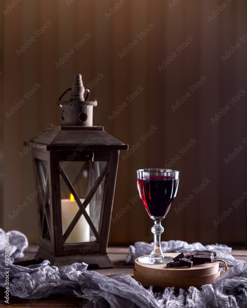 Glass with red wine. Near broken chocolate. Lantern with a candle in the background