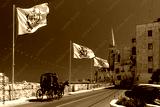 Festively decorated street with flags of all the Grand Masters of the Sovereign Military Order of Malta in the old town of Valletta, Malta