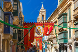 Festively decorated street with banners for St Augustine Feast in the old town of Valletta, Malta. Flaming, arrow pierced heart - symbol of St Augustine