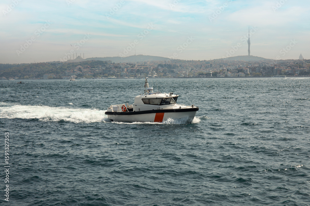 A patrol boat operates on the sea close to Istanbul's coastline