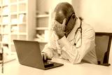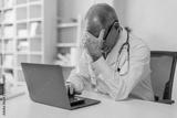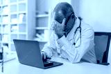 Portrait of sad male doctor upset tired medical worker closing head with hands. Depressed male doctor sitting in office. stethoscope on persons neck. Modern medicine and healthcare concept