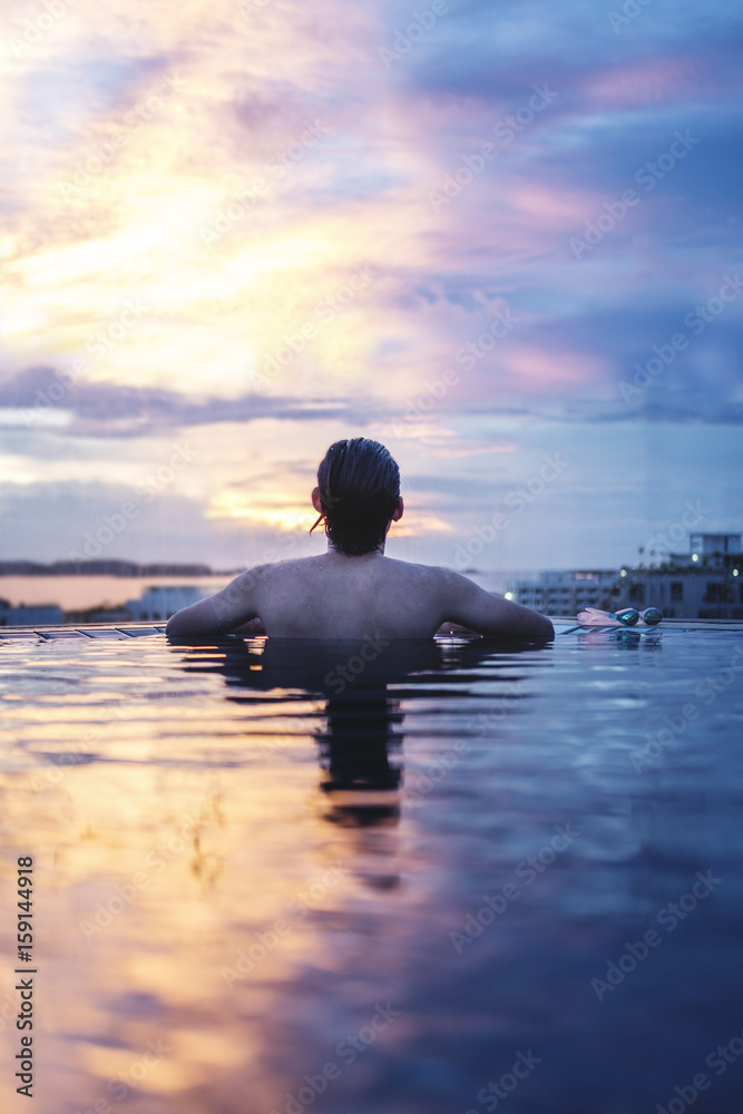 a man relax in the water under sunset sky in summer
