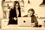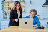 Teenage boy student with female mentor trainer teacher looking at laptop computer screen