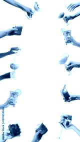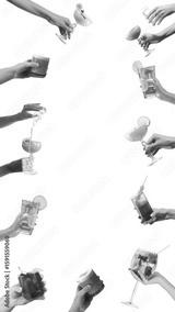 Collage of vibrant cocktails and pouring motion with clean white background. Concept of drink recipe design, modern bar ads, creative beverage content, food and drink UX, UI.