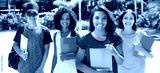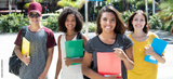 Junge südamerikanische Studentin mit anderen Stundenden in der Stadt
