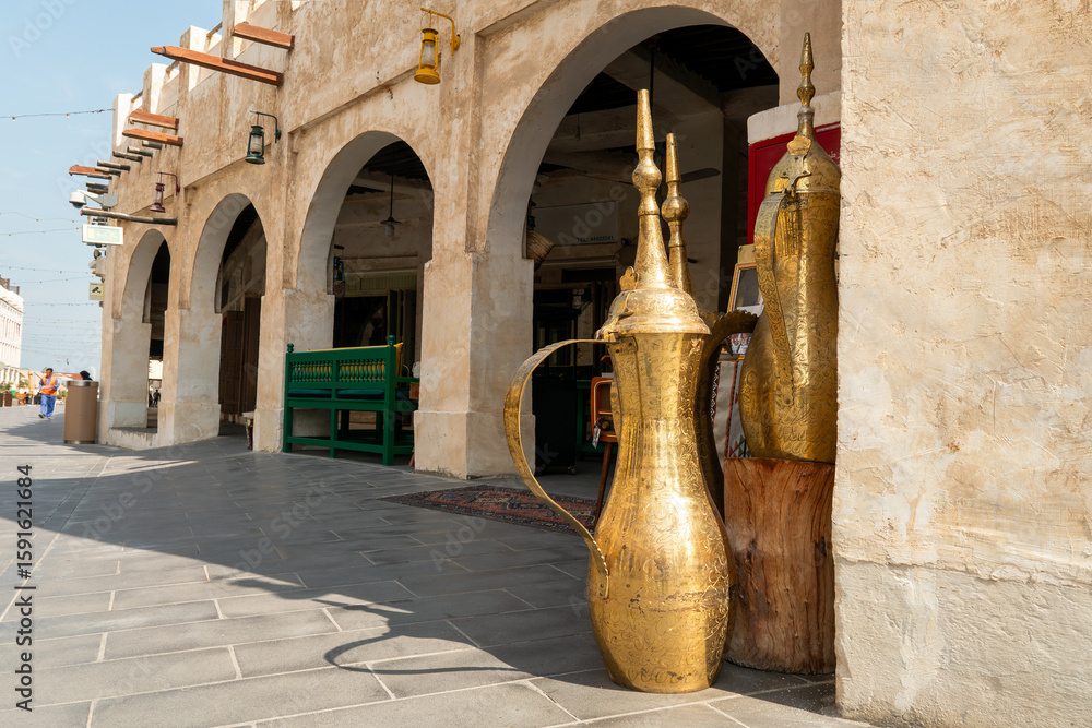Traditional Arabic souvenirs and large golden coffee pots on display at Souq Waqif market in Doha, Qatar. Cultural Middle Eastern setting with vibrant details, no people.