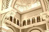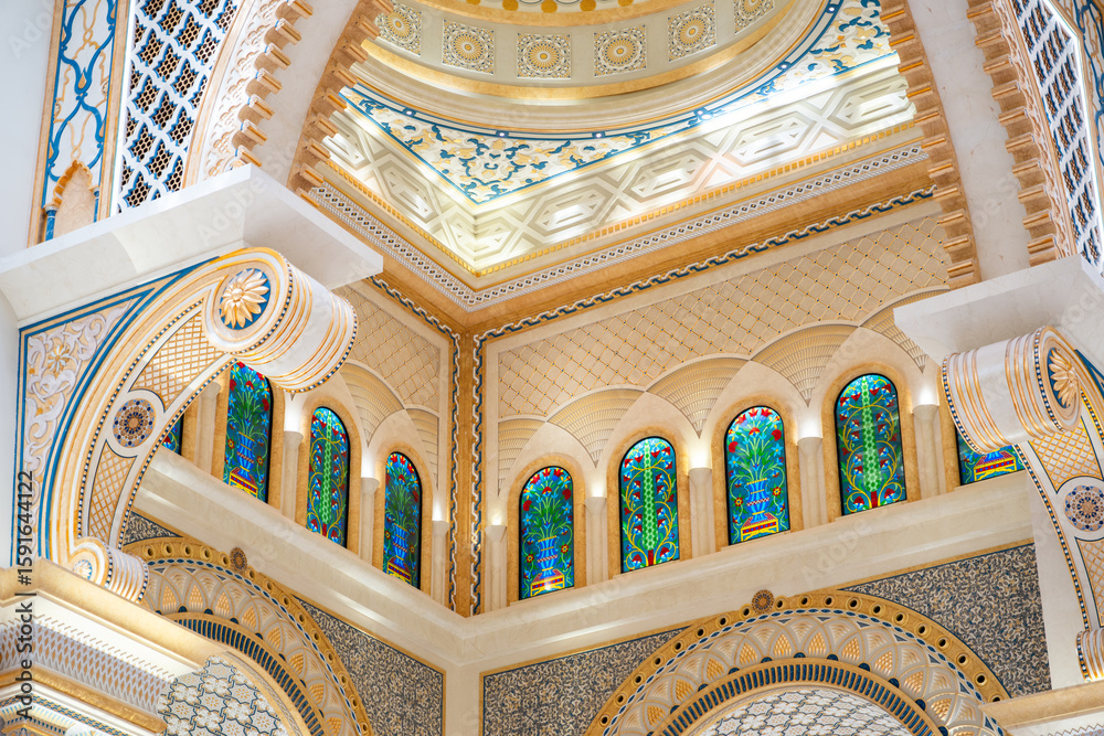 Intricate architectural ceiling with stained glass windows and ornate patterns in beige and blue tones.