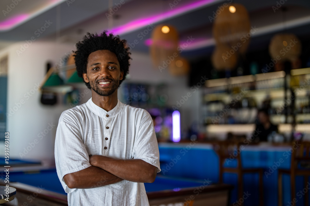 Confident young man with folded arms smiling in a stylish modern bar or lounge area with pool tables, bar shelves, and vibrant ambient lighting