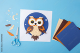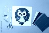 Owl made of layered paper with stars and moon on blue background. Paper craft flat lay composition with scissors and colored sheets. Nighttime children craft project. Flat lay copy space