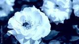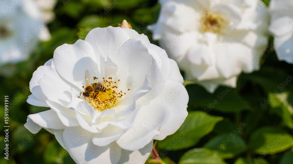 Busy bee pollinating a white rose in a vibrant garden under bright sunlight