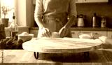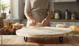 Copy space on wooden table with background of woman kneading dough on pastry board in bright home kitchen – cozy atmosphere of homemade cooking, family food and natural ingredients concept.