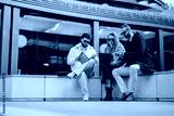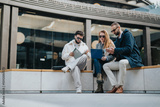 Outdoor gathering of three business people discussing work and sharing ideas using electronic devices. Urban setting with modern surroundings emphasizes a professional and collaborative atmosphere.