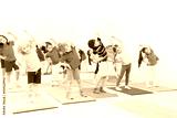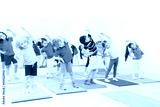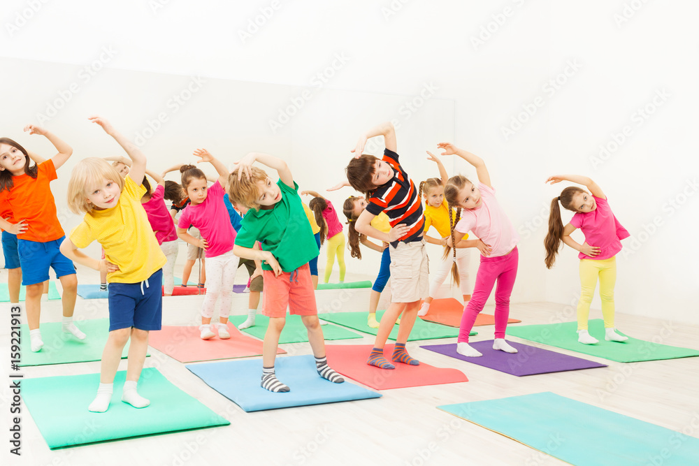 Happy kids doing side bending exercises in gym