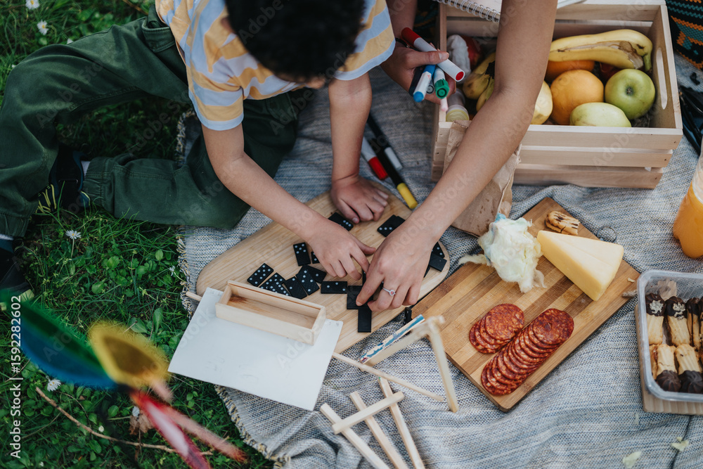 A close-up of a Filipino family having fun outdoors, playing games, and enjoying picnic snacks together.
