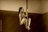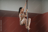 A focused woman performs advanced pole dancing movements showcasing strength, flexibility, and grace during a workout session in a contemporary dance studio.