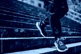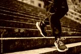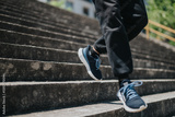 An individual wearing athletic shoes runs up a staircase in a sunny outdoor park, showcasing activity and exercise.