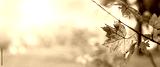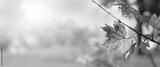 Bright maple leaf changing color on a branch under the sun's rays, standing out against a soft blurred natural background, symbolizing the arrival of autumn
