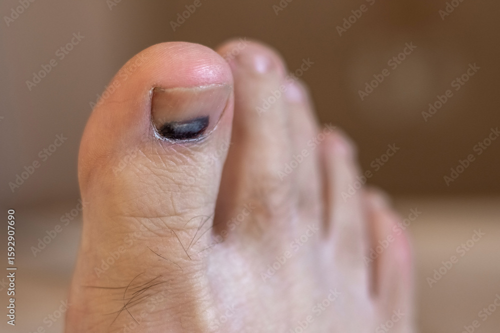 Close-up of toes with a bruised and discolored big toenail, indicating an injury
