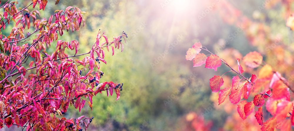 Early autumn: bright red leaves on tree branches, blooming in the sunlight against a blurred natural background, creating a festive and atmospheric landscape
