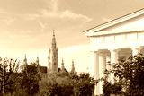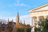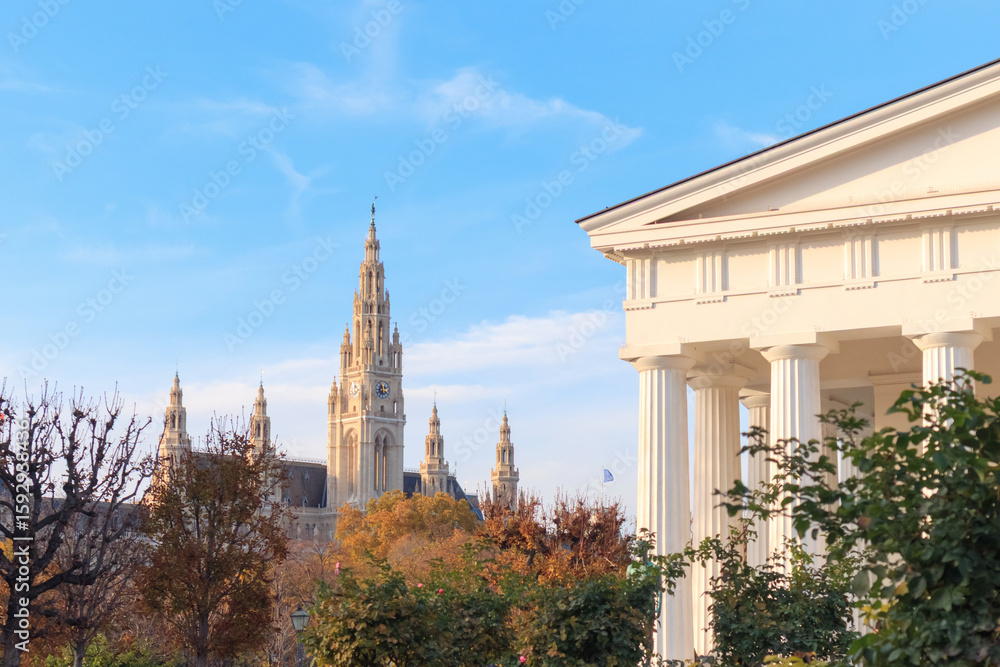 A stunning view of Vienna showcasing the impressive tower of the city hall and classic white columns amidst vibrant fall foliage. The clear blue sky adds to the charm of the scene.